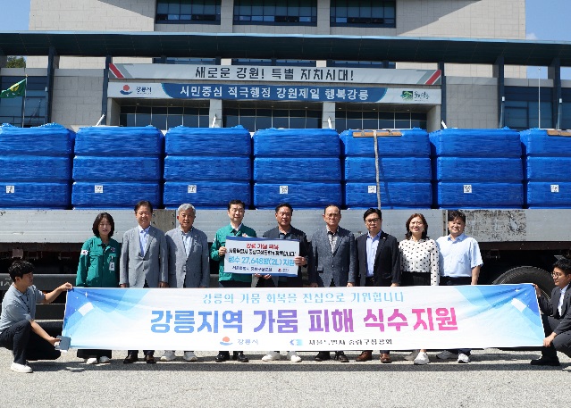 서울상공회의소 중랑구상공회 (회장 권혁길)는 2025년 9월 10일(수) 오전 11시30분에 강릉시청을 찾아 강릉지역 가뭄위기 극복을 위한 생수(2리터) 27,648병, 금액으로는 1,935만여원을 전달했다.이날 전달식에는 김종화 명예회장과 이용태, 김은희 수석부회장이 함께하였으며, 강릉시에서는 김상영 강릉시 부시장, 김기영 강릉시의원, 나영진 강릉상공회의소 회장이 맞이해 주었으며, 중랑구상공회의 물 기부에 대해 강릉시를 대표하여 "귀한 정성을 기탁해 주셔서 감사드리며, 강릉시 가뭄 극복을 위해 최선을 다하겠다"고 진심 어린 감사의 말을 전하였다.이에 권혁길 회장은 "저수율 10%가 붕괴되는 등 극심한 가뭄을 겪고 있는 강릉시의 물 부족 문제를 돕기 위해 각계각층의 도움이 이어지고 있으며, 가뭄으로 큰 어려움을 겪고 있는 강릉시민들과 상공인들에게 조금이나마 도움이 되기를 바란다"고 위로의 말을 전하였다.또한, 이번 지원을 계기로 강릉시와 강릉상공회의소, 중랑구상공회 간 교류를 활성화하고 더 깊은 관계로의 발전을 약속하였다.